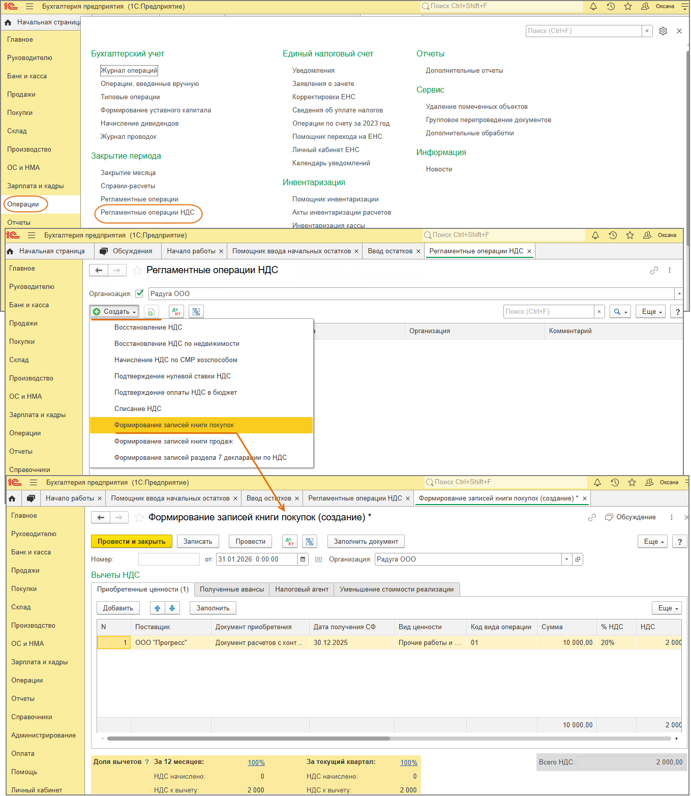 - Кнопка "Создать" - выбрать "Формирование записей книги покупок".