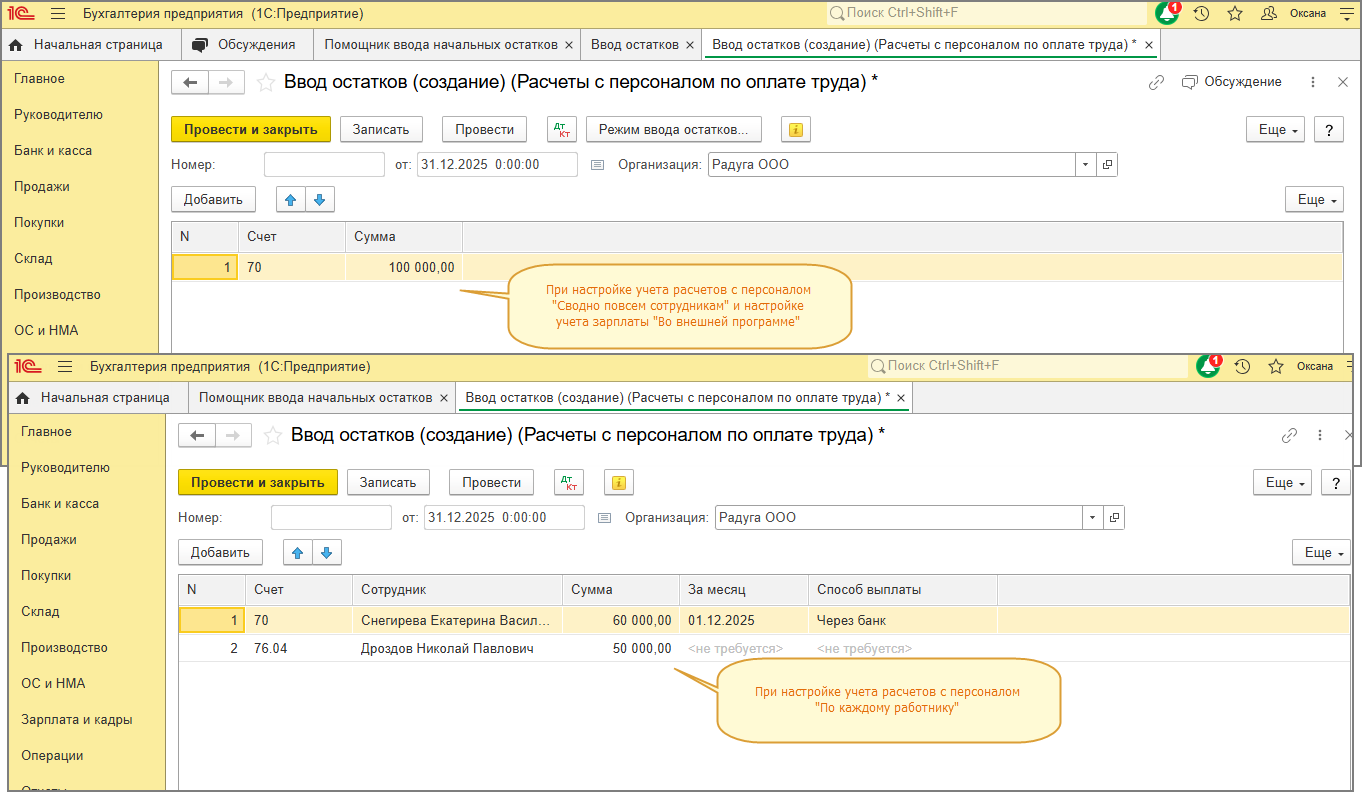 - если учет ведется "По каждому работнику", то в колонке "Сотрудник" выберите сотрудника (предварительно создайте соответствующий элемент справочника), укажите сумму остатка и месяц образования задолженности. В колонке "Способ выплаты" выберите способ выплаты "Через кассу" или "Через банк". Заполните остатки по каждому сотруднику.