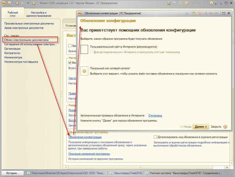 Если вы зарегистрированы на сайте users.v8.1c.ru как пользователь программы «1С:Клиент ЭДО 8», то получение и установка обновления могут быть выполнены программой автоматически. Управление этим процессом осуществляется в режиме обновления конфигурации. Для перехода в этот режим можно использовать форму Обновление конфигурации.