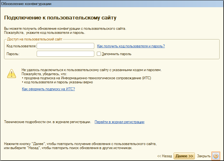 На следующем шаге нужно указать код пользователя и пароль для доступа к сайту. Доступ к этому сайту имеют только зарегистрированные пользователи программ системы «1С:Предприятие 8».