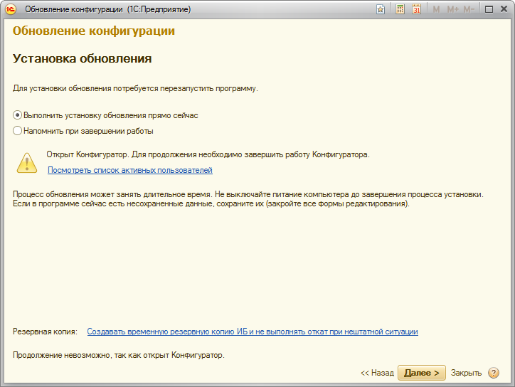 После нажатия кнопки Далее > программа автоматически создаст резервную копию информационной базы и обновит конфигурацию. Процесс обновления конфигурации может занять продолжительное время, в зависимости от производительности компьютера и объема информационной базы.