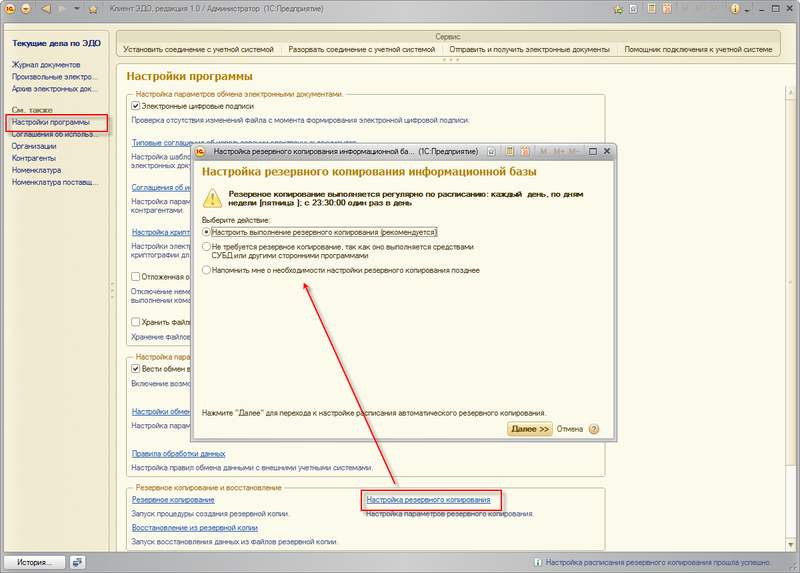 Помощник Настройка резервного копирования информационной базы открывается командой Настройка резервного копирования, в форме Настройки программы.