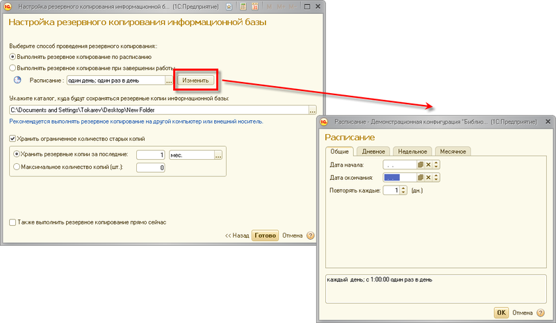 Если установлен флажок Также выполнить резервное копирование прямо сейчас, то после нажатия на кнопку Готово система сохранит указанные настройки и выполнит резервное копирование.