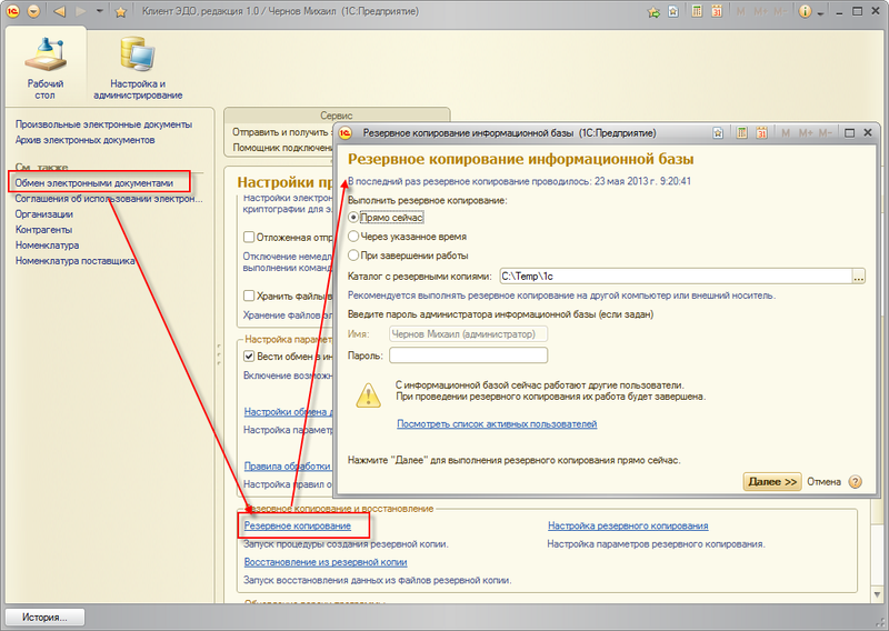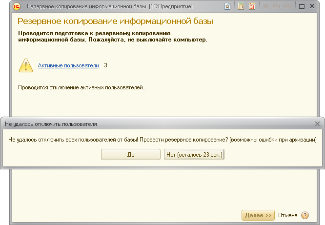 Если система не сможет завершить работу всех пользователей, то примерно через 5 минут она предложит выполнить резервное копирование при подключенных к ИБ пользователях. С предложением системы можно согласиться, если администратор уверен в том, что подключенные пользователи не вводят данные в ИБ (например, если пользователи в конце рабочего дня забыли выйти из системы). В противном случае необходимо завершить сеансы пользователей на их рабочих местах.