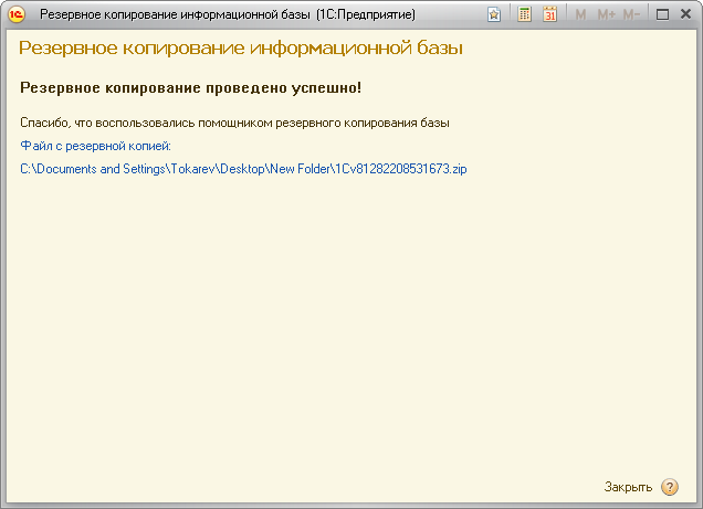 После окончания резервного копирования система будет запущена снова, откроется форма с информацией о выполненной процедуре резервного копирования.