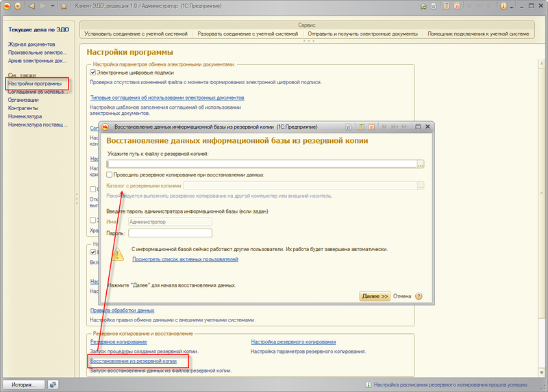 Для восстановления данных из резервной копии используется помощник Восстановление данных информационной базы из резервной копии.