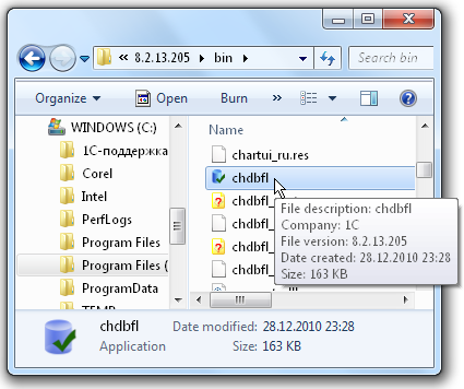 1. Для запуска утилиты в каталоге установки приложения 1С:Предприятие дважды щелкнуть мышью по наименованию файла chdbfl.exe.