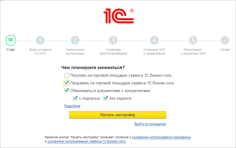 ■ Продавать на торговой площадке сервиса 1С:Бизнес-сеть – включает регистрацию организации в сервисе «1С:Бизнес-сеть» на шаге «Заполнение организации».
