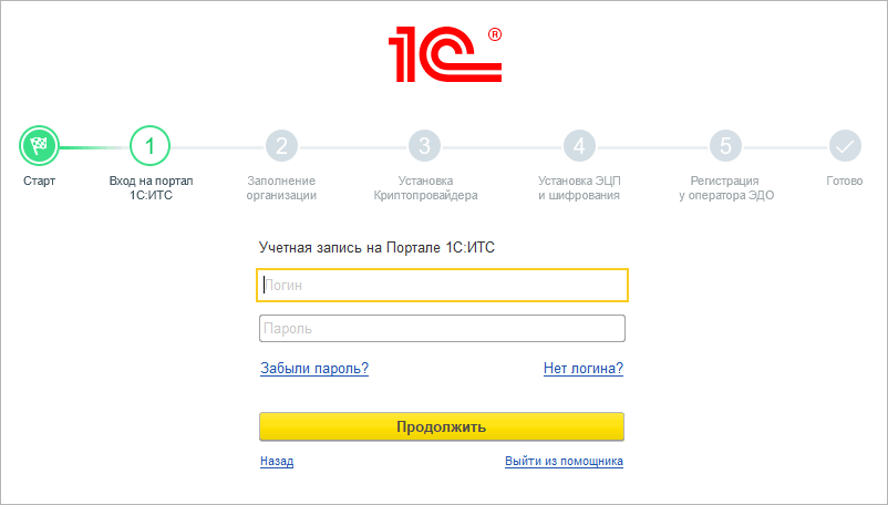 На первом шаге необходимо указать логин и пароль учетной записи на пользовательском портале 1С:ИТС.