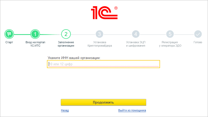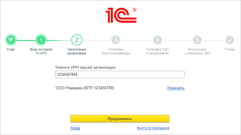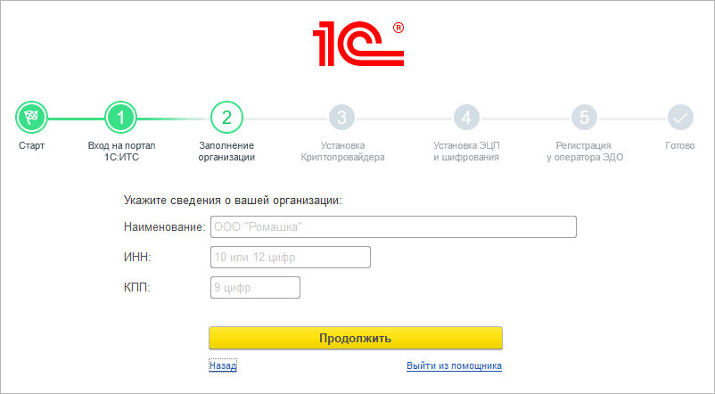 На втором шаге необходимо заполнить данные об организации: ИНН, КПП, наименование.