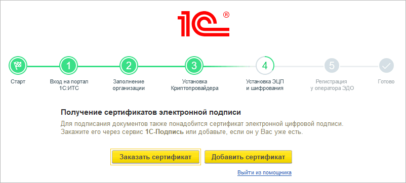 Для подписания документов необходим сертификат электронной подписи, который можно выбрать из установленных на компьютере либо заказать новый через сервис «1С:Подпись». Подробнее см. в разделе «Настройка сертификатов подписей».