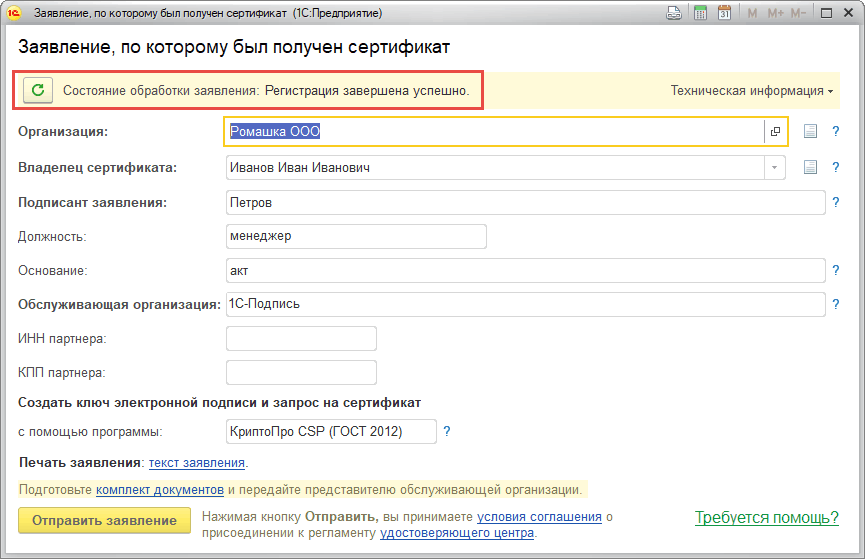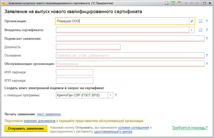 При выборе Заказать сертификат откроется форма заявления для заполнения данных и их отправки в сервис «1С:Подпись».