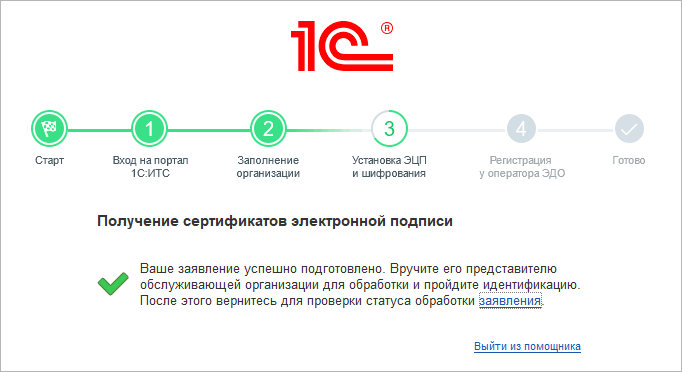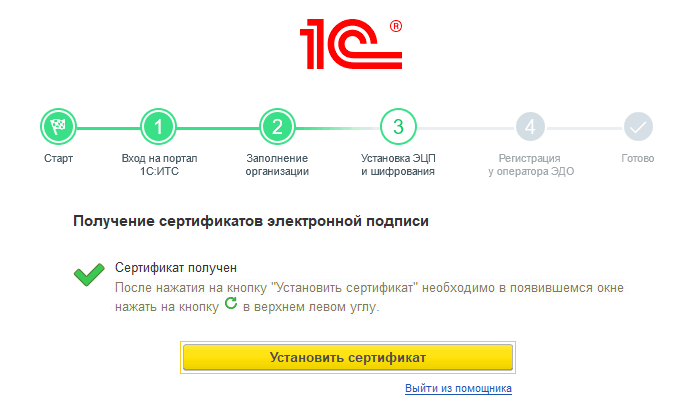 После успешной установки сертификата и закрытия формы заявления в помощнике отобразится страница с результатом установки сертификата.