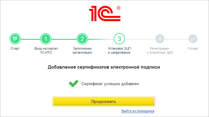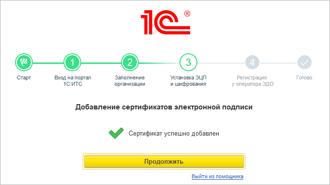 После успешного завершения добавления сертификата в помощнике сменится страница и можно будет перейти к следующему шагу настройки.