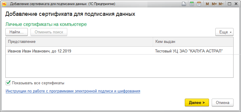 При выборе Добавить сертификат откроется форма со списком сертификатов подписи, установленных на компьютере.
