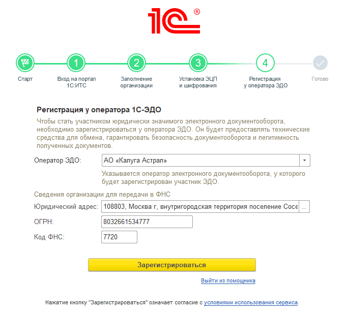На странице помощника необходимо выбрать в списке одного из доступных операторов и заполнить сведения об организации для передачи в ФНС: юридический адрес, ОГРН, код ФНС.