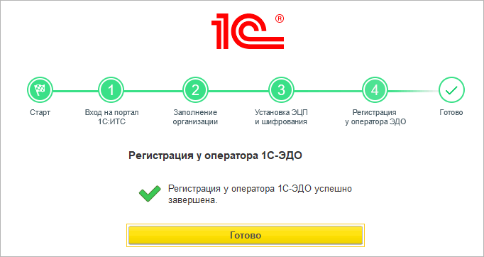 Регистрация у оператора ЭДО проходит за пару минут в зависимости от быстродействия сети – нужно дождаться завершения регистрации. После успешного ее завершения страница сменяется на страницу завершения регистрации у оператора ЭДО.