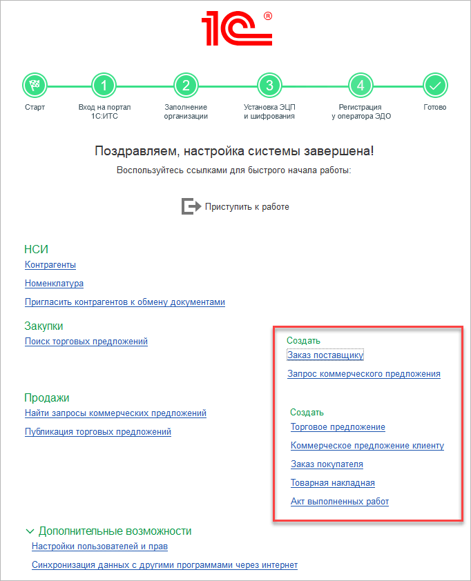 ■ Покупать на торговой площадке сервиса 1С:Бизнес-сеть – включает регистрацию организации в сервисе «1С:Бизнес-сеть» на шаге «Заполнение организации».