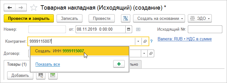 В открывшейся форме документа в поле Контрагент ввести ИНН или наименование получателя. Если такого контрагента нет в базе, то программа предложит добавить нового.