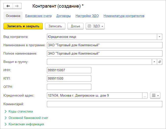 При создании контрагента открывается форма карточки с автоматически заполненными реквизитами. Сведения о контрагенте заполняются по данным сервиса «1С:Контрагент». Если сервис не подключен, то данные необходимо заполнить вручную.