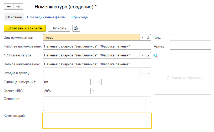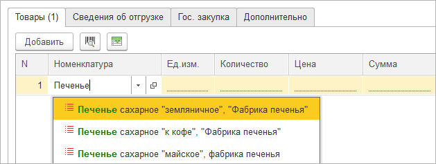 Сведения о товаре заполняются на одноименной вкладке. При вводе номенклатуры по строке в списке выбора отображаются товары, найденные в сервисе «1С:Номенклатура».