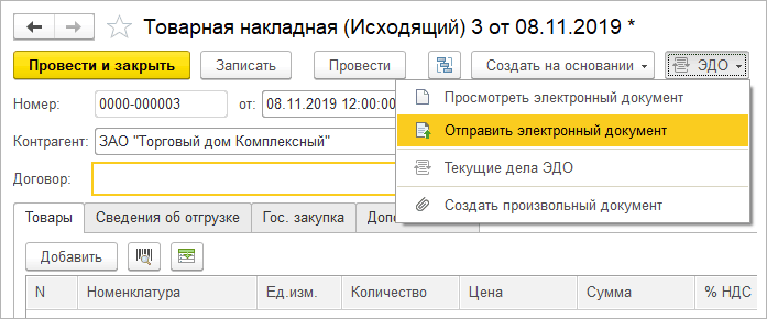 Для отправки документа необходимо выбрать команду Отправить электронный документ из группы команд ЭДО.