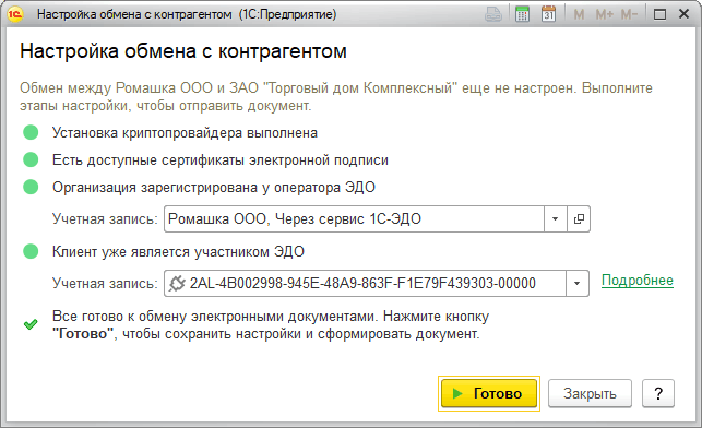 В результате нажатия кнопки Готово будет сформирован электронный документ и отправлено приглашение контрагенту. Электронный документ будет отправлен после получения положительного ответа от контрагента.