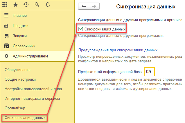 Для того чтобы использовать в программе возможности синхронизации данных, необходимо установить флажок Синхронизация данных в разделе Администрирование – Синхронизация данных.