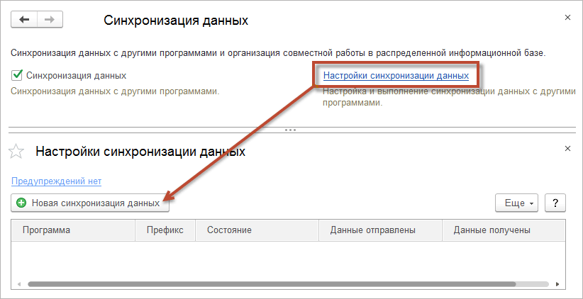 Для настройки синхронизации данных с другой программой необходимо перейти в панель настроек синхронизации данных.