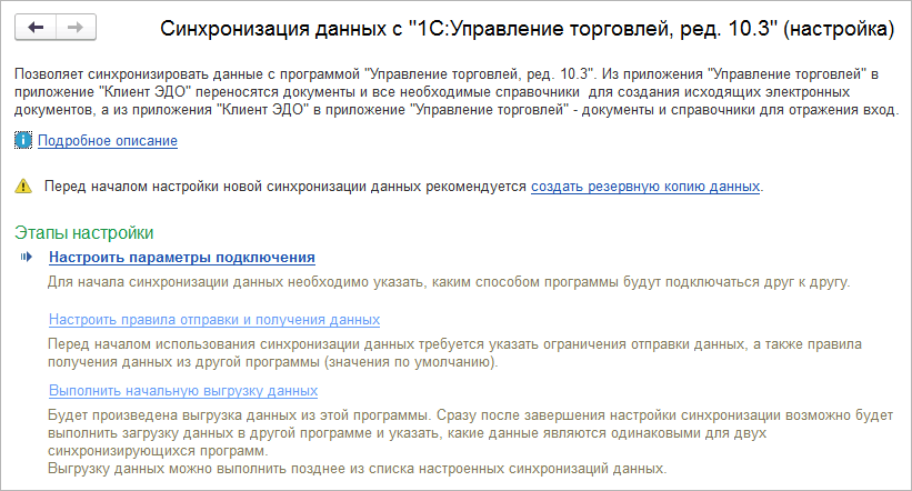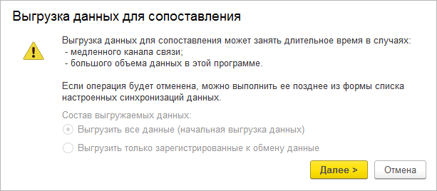 Перед синхронизацией данных рекомендуется создать резервную копию данных. Подробнее о резервном копировании см. в разделе «Резервное копирование информационной базы».