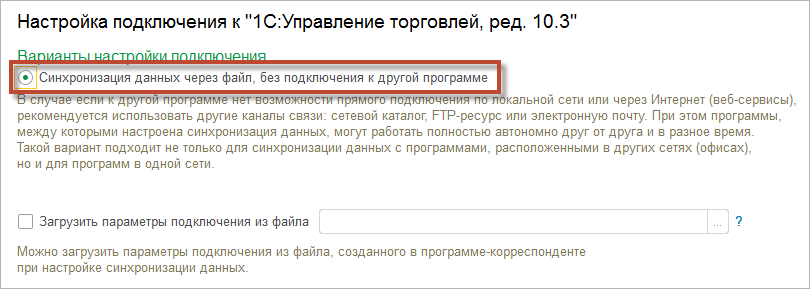 На странице Выбор способа настройки синхронизации данных с помощью переключателя нужно выбрать Загрузить файл с настройками, созданный в другой программе.