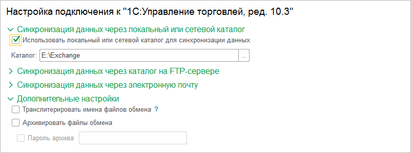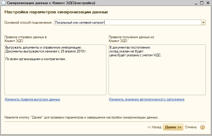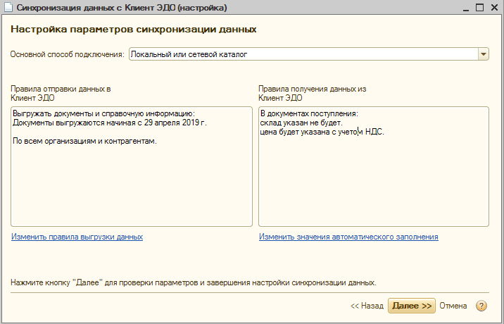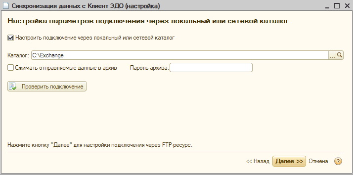 Далее следует выбрать подходящий канал связи, например Через локальный или сетевой каталог, заполнить необходимые параметры и нажать кнопку Далее.