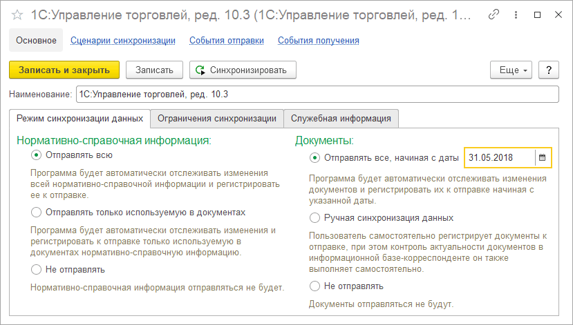 В форме настройки правил указать подходящий режим синхронизации данных и выбрать дату отправки, начиная с которой документы будут отправляться в программу-приемник.