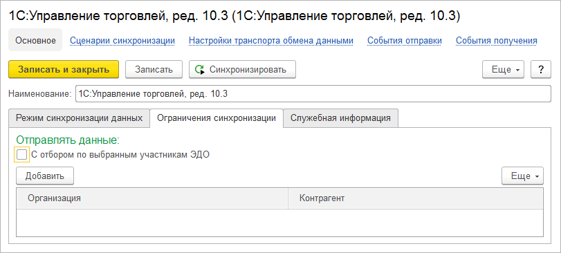 При необходимости отправлять данные только по определенным организациям и контрагентам нужно перейти на вкладку Ограничения синхронизации и заполнить список соответствующих участников ЭДО.