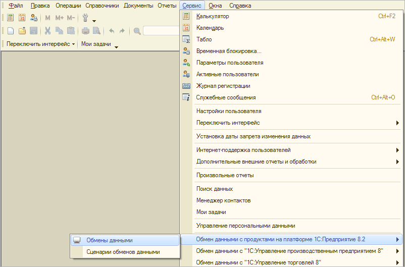 Настройка синхронизации осуществляется в два этапа – в каждой из баз, участвующих в обмене.