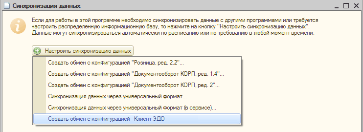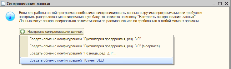 Нужно нажать кнопку Настроить синхронизацию данных и выбрать Создать обмен с конфигурацией «Клиент ЭДО».