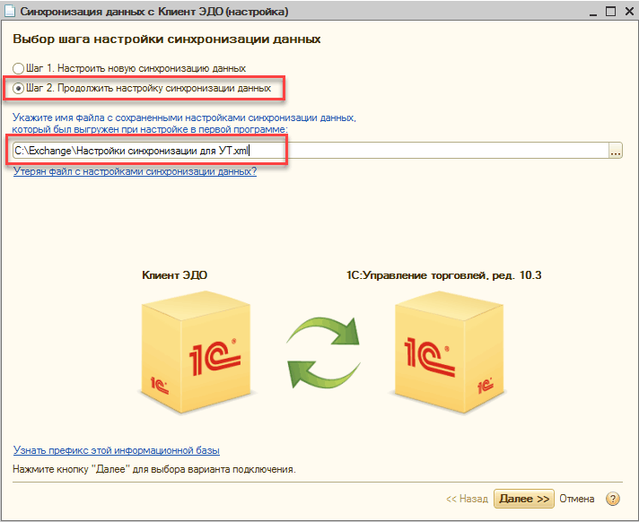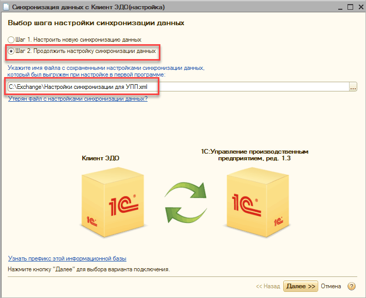 Необходимо выбрать Настроить параметры подключения. Указать способ подключения к программе-приемнику – Синхронизация данных через файл, без подключения к другой программе и нажать кнопку Далее.