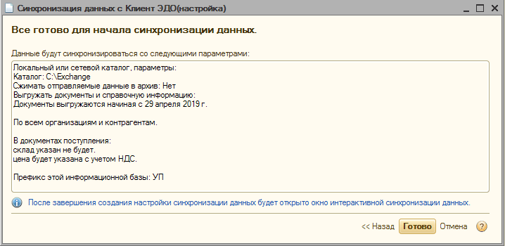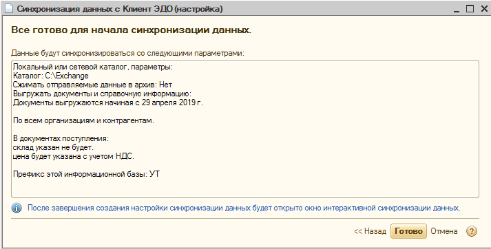 Для подтверждения параметров синхронизации следует нажать кнопку Готово. После этого будет открыт интерактивный помощник синхронизации данных, он поможет получить данные и отправить данные в «Клиент ЭДО».