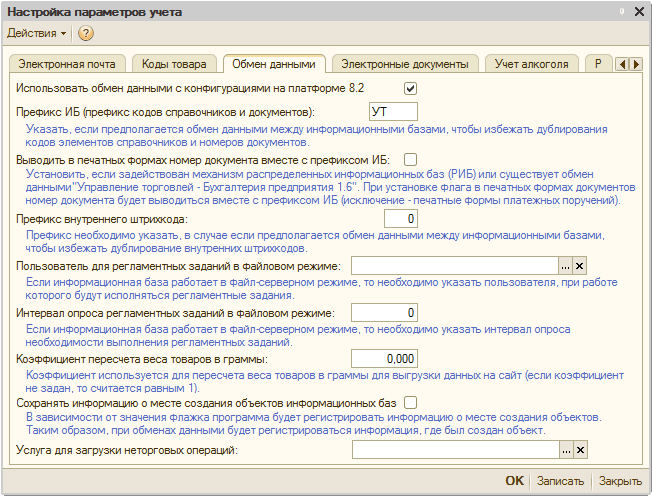 В настройке отправки документов также необходимо задать следующие параметры обмена:
