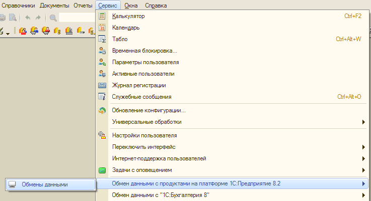 Необходимо установить флажок Использовать обмен данными с конфигурациями на платформе 8.2 на странице Обмен данными в форме Настройка параметров учета.