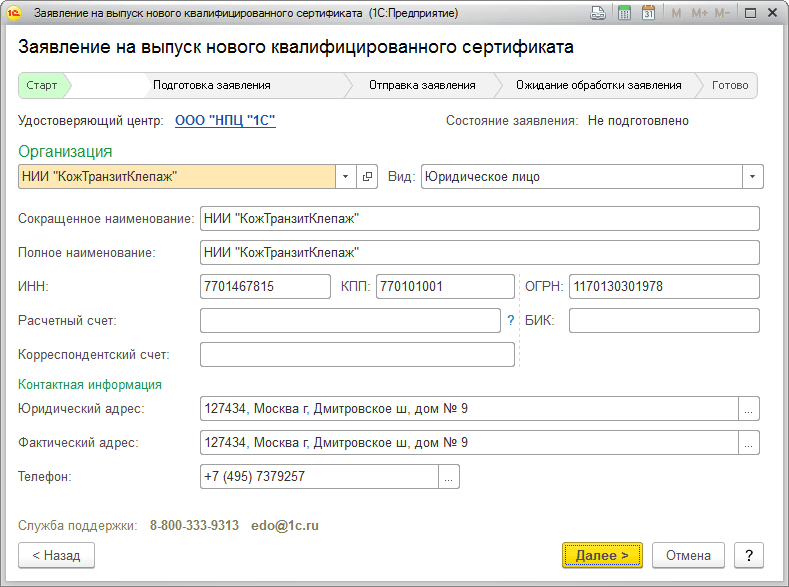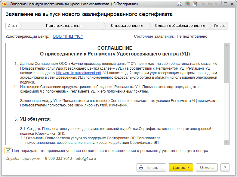 Необходимо ознакомиться с соглашением и подтвердить принятие условий, заполнить необходимые поля для перехода между разделами, нажимая Далее или Назад. После заполнения всех данных заявление будет передано в удостоверяющий центр, и программа загрузит подготовленный сертификат.