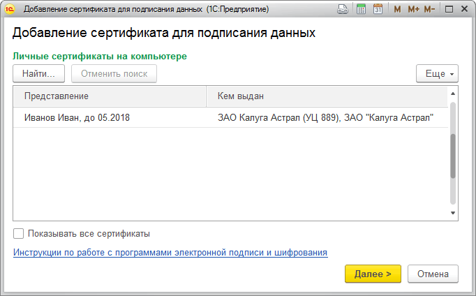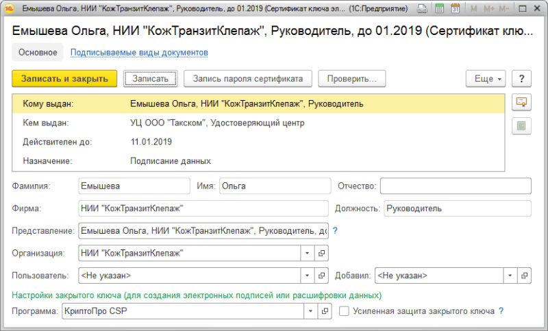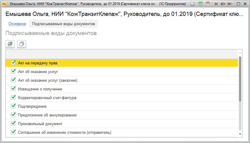 После того как сертификат добавлен в программу, в форме сертификата нужно задать виды документов, для подписания которых будет использоваться данный сертификат.