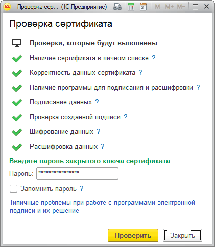 В форме сертификата по команде Проверить можно проверить корректность настроек криптографии для данного сертификата на текущем компьютере.