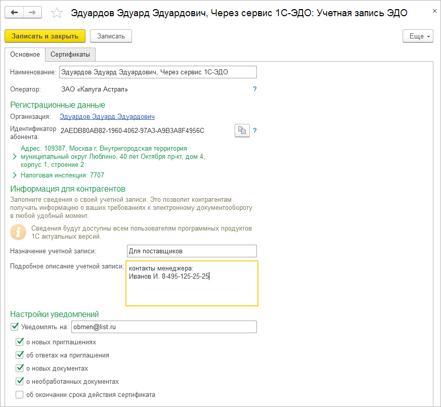 В форме учетной записи возможно изменить сертификаты учетной записи и сведения об организации, просмотреть регистрационные данные, идентификатор абонента (копируется в буфер обмена), скорректировать наименование учетной записи, информацию для контрагентов (назначение и подробное описание учетной записи), настройки уведомлений (для всех операторов сервиса, кроме «Такском»).
