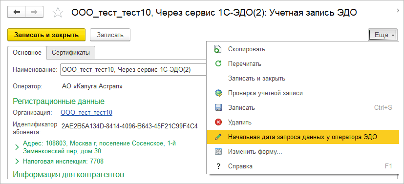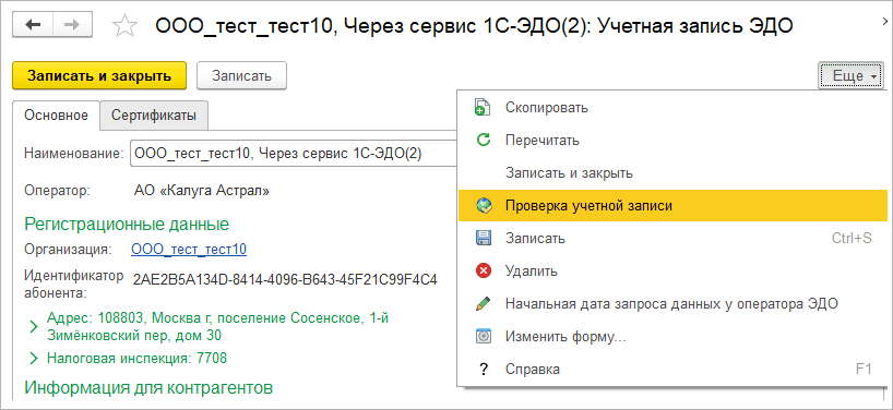 Для того чтобы проверить корректность выполненных настроек учетной записи ЭДО, можно воспользоваться командой Проверка учетной записи (Еще – Проверка учетной записи).