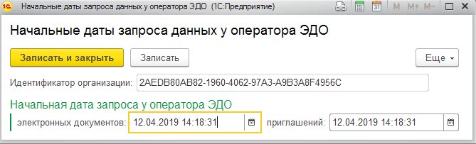 Если при обмене через оператора ЭДО все входящие пакеты электронных документов распаковываются без ошибок, то программа автоматически сдвигает метку времени, относительно которой будет производиться запрос следующей порции новых данных на сервере оператора ЭДО. В программе существует возможность управлять этой меткой времени для соглашения через оператора ЭДО вручную. Такая возможность будет полезна для получения повторно всех документов в чистую информационную базу или, наоборот, ограничения получаемых данных в случае, когда старые электронные документы надо отсечь от получения с определенного момента времени.