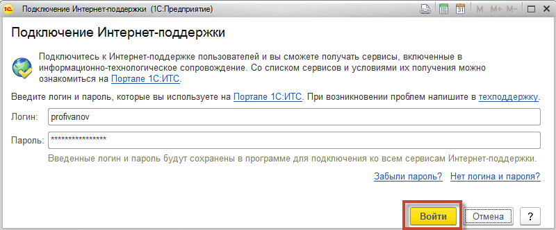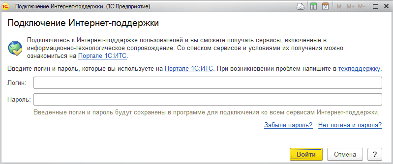 В окне Подключение Интернет-поддержки нужно ввести логин и пароль пользователя портала 1С:ИТС (https://portal.1c.ru), затем нажать Войти: