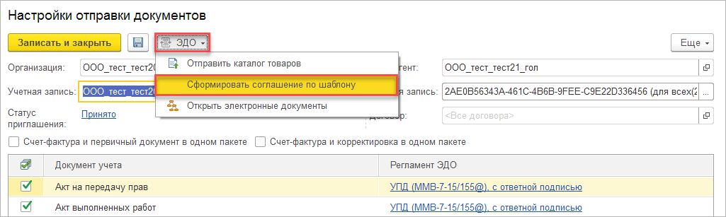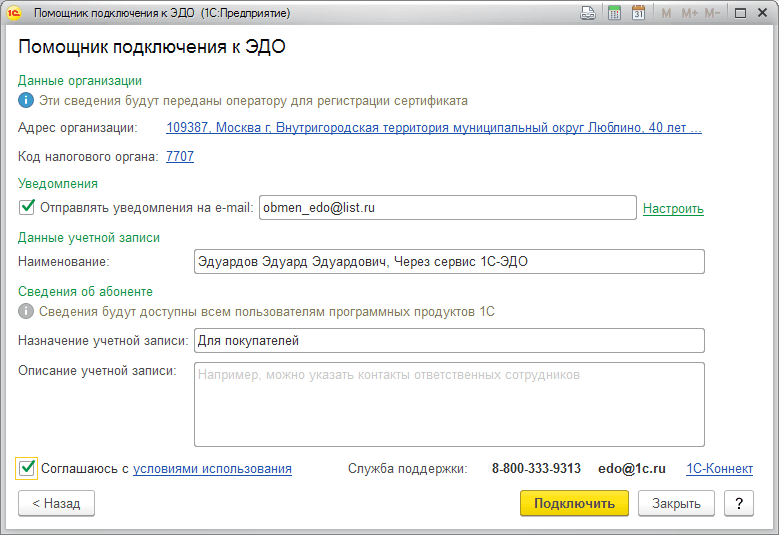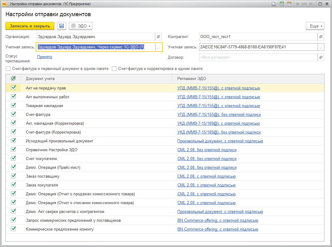 Результатом работы помощника будет новая учетная запись ЭДО для организации (Администрирование – Обмен электронными документами – Учетные записи ЭДО):