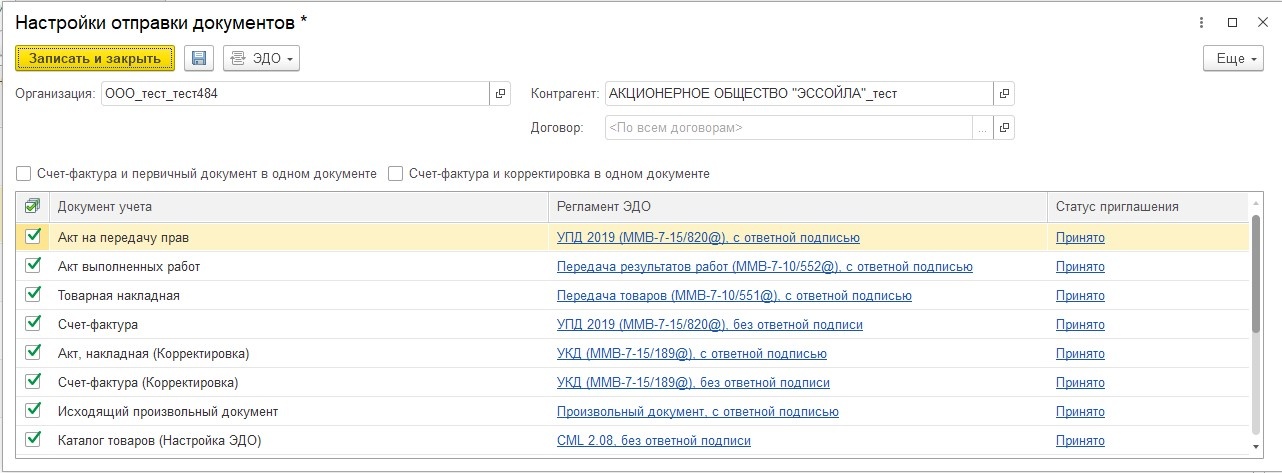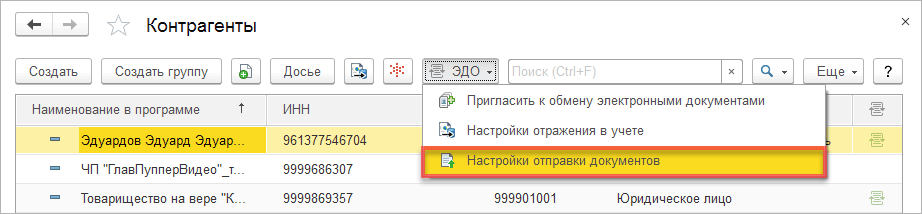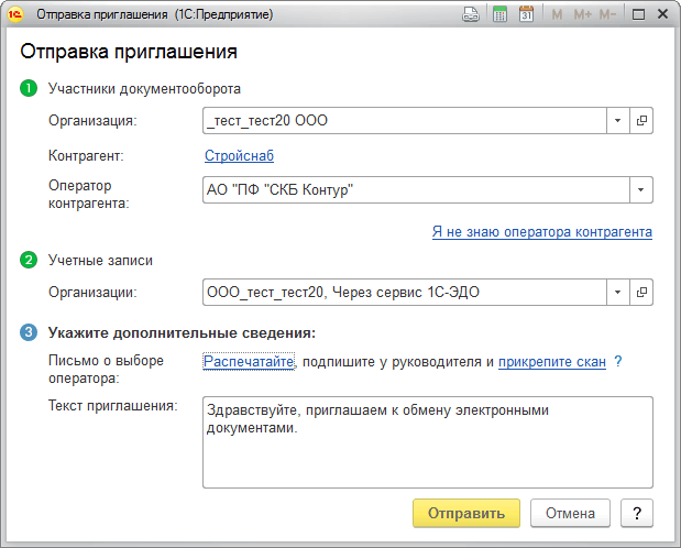 ■ Отправка приглашения контрагенту – отправка приглашения контрагенту для настройки с ним электронного документооборота.