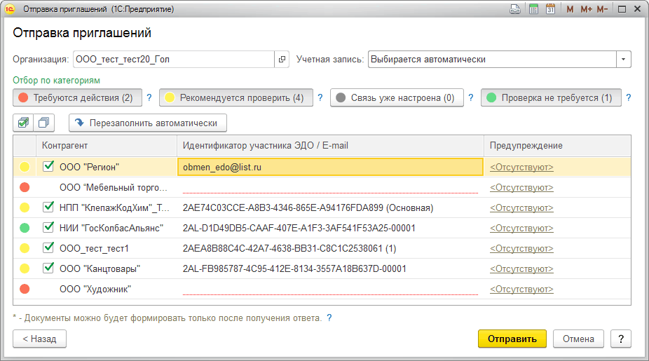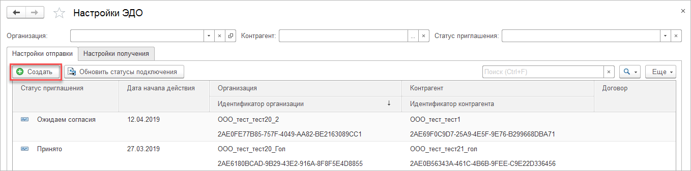Обмен с контрагентом через оператора ЭДО возможен только в том случае, если участник одобрил приглашение к обмену, тогда сервис оператора ЭДО вернет его Идентификатор и программа установит статус Принято.